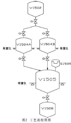 如圖2所示,在安慶石化的SHELL煤氣化裝置中, 粉煤灰的進(jìn)料與放料都有一套復(fù)雜的自動(dòng)順序控制系統(tǒng), 用于定時(shí)完成對介質(zhì)的進(jìn)料和放料, 工藝流程簡圖如下所示。循環(huán)順序控制基本分為減壓、放料、充壓、進(jìn)料等部分,鎖斗罐充壓后與上部高壓設(shè)備均壓連通進(jìn)料, 進(jìn)料完成之后與上部高壓設(shè)備隔離,減壓至接近常壓,再與下部放料罐均壓連通放料, 較后放料罐常壓放料。運(yùn)行中在進(jìn)料和放料時(shí)鎖斗罐收集的灰量是作為循環(huán)順序控制中的判別條件,這個(gè)重量達(dá)到設(shè)定值則程序向下進(jìn)行,鎖斗罐與上下兩臺(tái)設(shè)備間的高低壓隔離以及均壓后連通和放料,否則程序保持,繼續(xù)收集煤灰。因此不難理解對鎖斗罐收集的灰進(jìn)行稱量是保證在不中斷氣化爐運(yùn)行的情況下定期對灰進(jìn)行收集和放料。