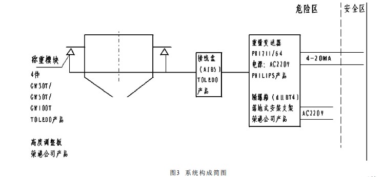 如圖3所示,安裝在底部的四個(gè)壓式稱重模塊將罐體的重量信號(hào)傳至接線盒。接線盒并聯(lián)各路稱重模塊信號(hào), 并可根據(jù)各稱重模塊受載情況調(diào)節(jié)角差, 經(jīng)過匯集后的重量信號(hào)送至稱重量變送器。重量變送器將重量信號(hào)處理成相應(yīng)的重量數(shù)據(jù)傳輸?shù)紻 C S控制系統(tǒng)。